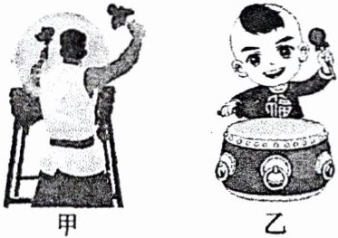 6. 如图所示,甲鼓发声时鼓皮每秒振动的次数比乙的少,甲、乙相比,甲鼓皮(
