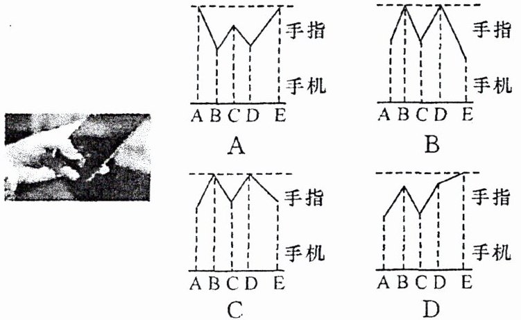 7. 如图,某手机内置有超声波识别系统,手机发出的超声波遇到手指上凸凹不平的指纹 A、B、C、D、E 五个位置,测得回收信号的时间分别为 0.27 ms、0.41 ms、0.27 ms、0.41 ms、0.19 ms,可求出手指与手机平面的距离,则该处指纹的大致形状是(