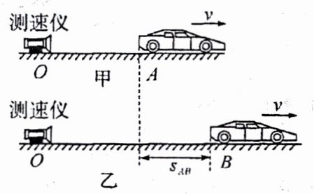 1. 为了监测超速行驶的违法行为,公路上常常设置有超声波测速仪,如图为某公路直线路段的一处测速仪,测速仪能发射和接收超声波。当行驶的小车距离测速仪 $ s_{OA}=62m $ 时(如图甲),测速仪向小车发出超声波,超声波“追上”小车时,小车刚好运动到 $ B $ 点(如图乙)。测速仪从发出超声波到接收反射回来的超声波所用的时间为 $ 0.4s $。超声波的速度为 $ 340m/s $。求: