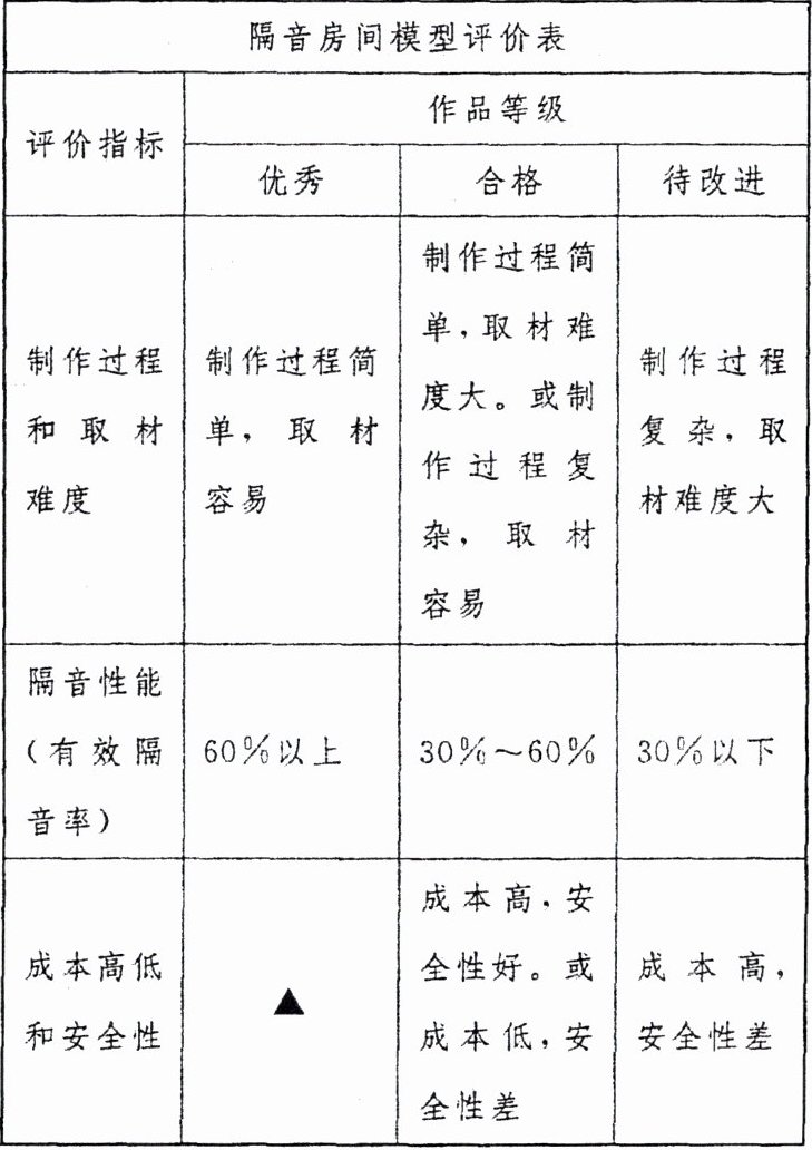 1. 对制作好的隔音房间模型,要从多个方面综合去评价考虑,请将下表中“▲”处补充完整:
