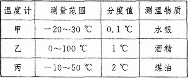 9. 北京五中校本经典题研究电冰箱内的温度分布情况,需要将几支温度计分别放在冰箱内多个位置,几分钟后,记录各测量点的温度。为了顺利完成这项研究,表中提供的三种规格的温度计应选用