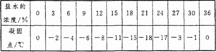 分析表格中数据可知,当盐水浓度增大时,其凝固点