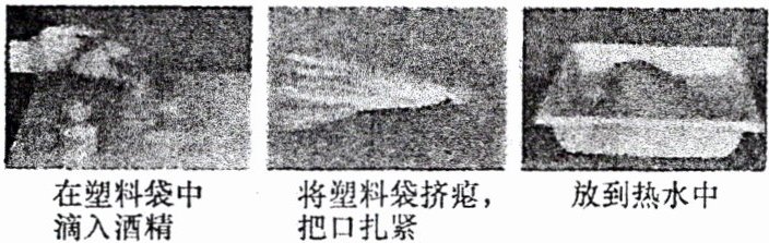 1. 如图所示,在透明塑料袋中滴入几滴酒精,将塑料袋挤瘪,排尽空气后用绳把口扎紧,然后放入热水中,会看到塑料袋鼓起来,是由于袋内液体酒精变成