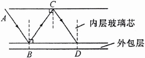 10. 光在玻璃纤维中的传输情况是光线每次由内层玻璃芯射向与外包层的分界面时,均要发生反射,光在不断地反射中沿内层玻璃芯向远处传播。如图所示,当增大入射光线 AB 的入射角时,CD 光线的入射角将