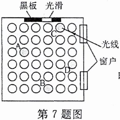 7. 教室黑板用久后有一部分变得光滑,容易发生镜面反射。如图所示,当太阳光从右侧窗户射入时,最有可能因反光看不清光滑处文字的同学是(