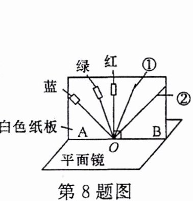 红、绿、蓝三种色光的激光笔进行实验,他将位于同一平面内的白色纸板立在平面镜上。下列说法中正确的是(C