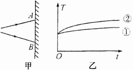 13. (2024·苏州)如图甲所示,$ A $、$ B $ 之间是太阳光经三棱镜色散后在屏上得到的彩色光带。将电子温度传感器分别放在 $ A $、$ B $ 两点外侧,测得温度 $ T $ 随时间 $ t $ 变化的图像如图乙所示。则曲线①对应光线的特点是____,曲线②对应的光线是____。