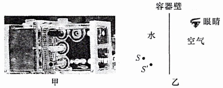 14. (2024·菏泽)2024 年 4 月 26 日,神舟十八号载人飞船成功对接中国空间站,装有 4 条斑马鱼的特制透明容器顺利转移到问天实验舱,如图甲所示。请你在图乙中画出航天员看到斑马鱼的光路图($ S $ 表示斑马鱼的实际位置,$ S' $ 表示航天员看到的斑马鱼的像的位置,不考虑容器壁对光线的影响)。