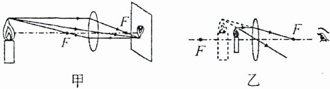 5. 如图甲所示,光通过凸透镜折射后会聚成像,将光屏放在像的位置,能够记录下所成的像,这种像叫____像;物体和像在凸透镜的____(填“同侧”或“两侧”)。如图乙所示,光通过凸透镜折射后没有会聚,当人眼逆着折射光的方向看去,感到光是从像的位置发出的,这种像____(填“能”或“不能”)呈现在光屏上,所以叫____像;这种情况下,物体和像在凸透镜的____(填“同侧”或“两侧”)。