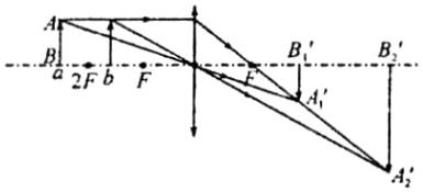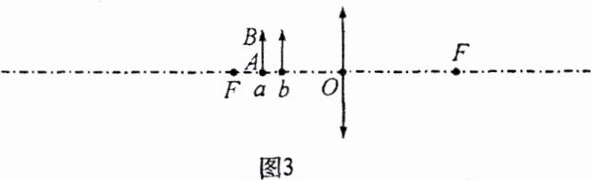 3. 请参照图1,在图3中画出物体AB分别在a、b两点时经过凸透镜所成的像A₁'B₁'、A₂'B₂'及其光路图。