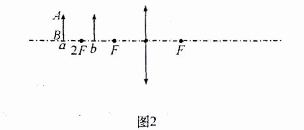 2. 请参照图1,在图2中画出物体AB分别在a、b两点时经过凸透镜所成的像A₁'B₁'、A₂'B₂'及其光路图。