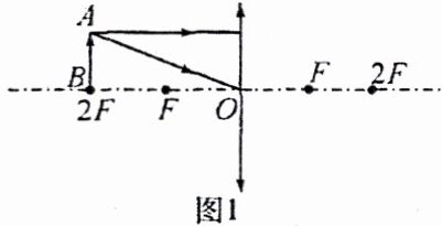1. 凸透镜成像规律可以通过画光路图去理解。在光路图中凸透镜可以用“↑”表示,O点为光心,F为其焦点。请在图1中运用经过凸透镜的两条特殊光线,画出物体AB经凸透镜成的像A'B'及其光路图。