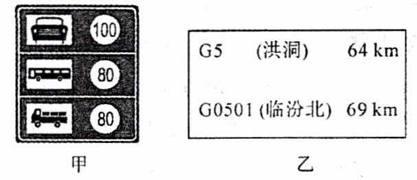 (2) 在回程途中经过G5高速公路,某处竖立了两块交通牌,如图甲、乙所示,请根据交通牌的含义计算,在遵守交通规则的前提下,小明所乘的大巴车从交通牌到洪洞最快需要多少小时。