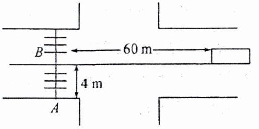 11. 中小学生上下学一定要注意交通安全。在如图所示的十字路口处,有一辆长$10m$、宽$2.2m$的客车正以$10m/s$的速度匀速行驶在马路中间,当它与斑马线AB相距$60m$时,马路边上的小王同学正好在斑马线A点以$1.2m/s$的速度穿过马路,客车行驶到斑马线所需时间为