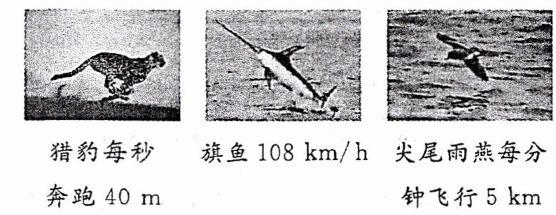 9. 现在陆地上跑得最快的动物是猎豹,在水中游得最快的动物是旗鱼,在空中飞得最快的动物是尖尾雨燕,如图所示是这三种动物及它们运动的有关数据,如果让这三种动物在一起比赛,冠军是(