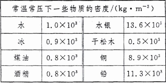 kg/m³,其物理含义是$1\mathrm{m^3}$的水的质量为$1.0 × 10^3\mathrm{kg}$
