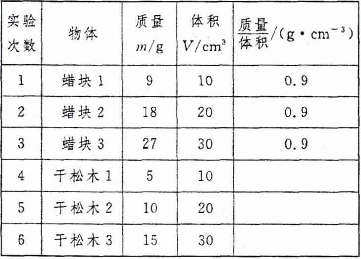 1. 为了探究“物质的质量跟体积的关系”,同学们找来大小不同的蜡块和干松木做实验,得到的数据如表所示。