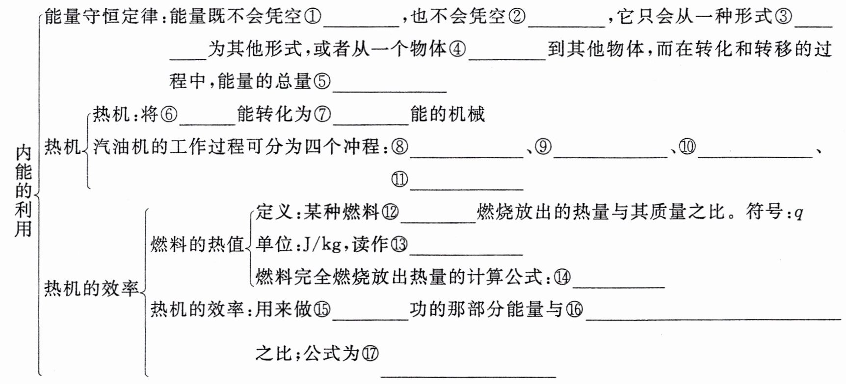 ①消失 ②产生 ③转化 ④转移 ⑤保持不变 ⑥内 ⑦机械 ⑧吸气冲程 ⑨压缩冲程 ⑩做功冲程 ⑪排气冲程 ⑫完全 ⑬焦每千克 ⑭Q=mq ⑮有用 ⑯燃料完全燃烧放出的热量 ⑰$\eta = \frac {W_{有用}} {Q_{放}} × 100\%$