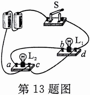 (填“$ ab $”或“$ cd $”)即可;要使两灯并联,只要将与电池负极相连的导线的 $ c $ 端改接在a