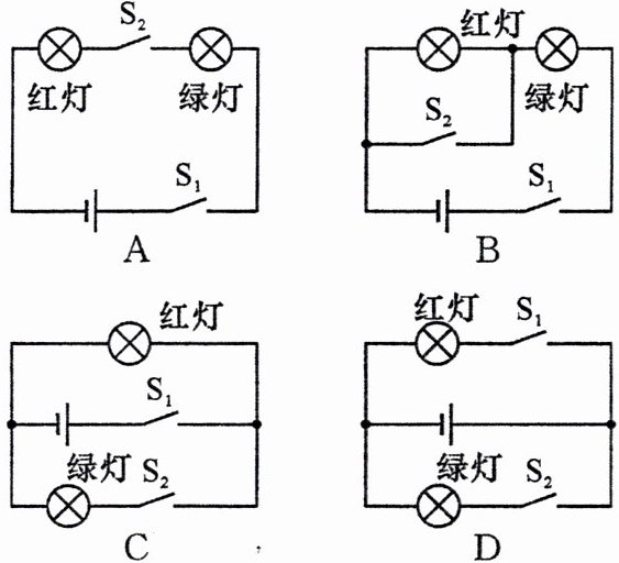 8. (2024·通辽)某交通路口指示车辆通行的信号灯由红灯和绿灯组成,红灯停,绿灯行,以下是红、绿灯工作时的电路简图。你认为正确的是(