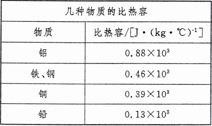 6. 某金属块质量为 $ 1.5kg $、温度为 $ 80^{\circ}C $,把它放在室外自然冷却,当放出 $ 6.6×10^4 J $ 热量时,该金属块温度降低了 $ 50^{\circ}C $,该金属块的比热容是多少?可能是哪种金属?