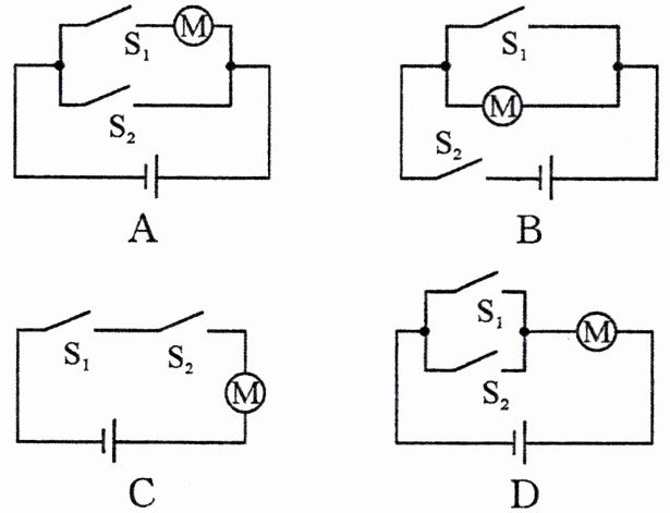 7. (2023·枣庄)现在的电动自行车为了安全设计了双钥匙电动安全锁,这里的钥匙相当于“开关”,只有两把钥匙同时使用(开关闭合)才能开锁。以下符合设计要求的电路图是(