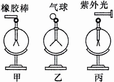 8. (2023·威海)用毛皮摩擦过的橡胶棒接触不带电的验电器金属球后,金属箔张角如图甲所示;接着用毛皮摩擦过的气球再接触金属球,金属箔张角变大,如图乙所示;然后用短波紫外光照射但不接触金属球,金属箔张角如图丙所示,此时金属球中的某种电荷“逃”到了空气中。下列推断错误的是(