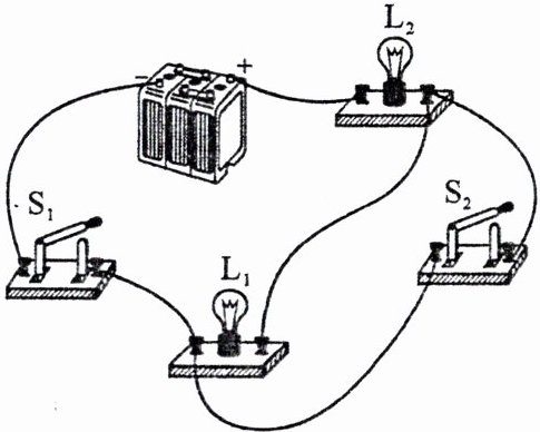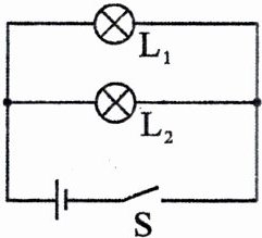 5. 小谢在做实验时,先连成如图所示的电路,闭合开关$S_{1}$并观察灯泡亮暗情况后,再闭合开关$S_{2}$,小谢看到的现象是(
