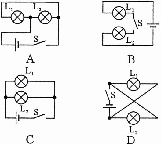 4. 如图所示的电路图中,闭合开关后两盏灯不属于并联的是(