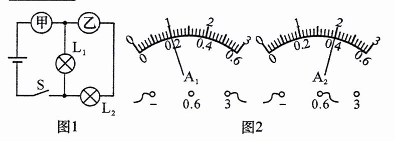10. 如图1所示电路,闭合开关$S$后,两电流表示数如图2所示。甲是电流表