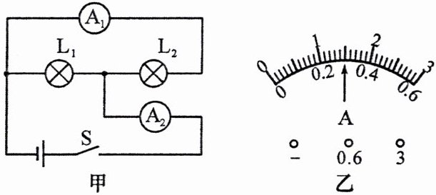 9. 电路如图甲所示,闭合开关,两灯泡均发光,且两个完全相同的电流表指针偏转均如图乙所示,通过灯泡$L_{1}$和$L_{2}$的电流分别为(