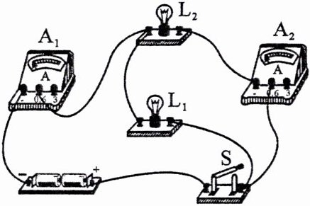 【变式】如图所示的电路,闭合开关后,两电流表的指针正常偏转且偏转角度相同,此时通过灯$L_{1}$和$L_{2}$的电流之比为(