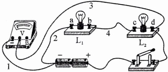 (填“L₁”“L₂”或“电源”)两端的电压。若要使电压表测量灯L₁两端的电压,只需要将导线3