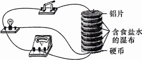 12. 小明将铝片和硬币依次堆叠,用浸有食盐水的湿布置于金属片之间自制“伏打电堆”并连接了如图所示电路。闭合开关,小灯泡发光,电压表指针右偏,下列说法正确的是(