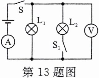 13. 如图所示电路中,电源电压为 3 V 且不变,只闭合开关 S 时,电流表示数为 0.3 A;当同时闭合开关 S、S₁ 时,电流表的示数将