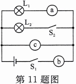 11. 在如图所示的电路中,a、b、c 分别代表的是电压表或电流表。当开关 S₁、S₂ 都闭合时,灯泡均正常发光,各个仪表均正常工作。下列说法中正确的是(