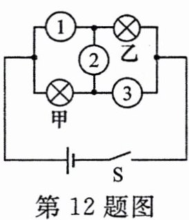 12. 如图所示,把甲、乙两个小灯泡连接在电路中,电表①②③可能是电流表或电压表,要求:在闭合开关 S 后,两灯泡串联且均能发光,则下列判断中正确的是(