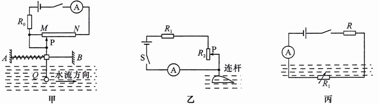 (后两空填“变大”“变小”或“不变”)。3. 有些材料的电阻随压力的增大而减小,在图丙所示装置图中,$ R_{1} $ 为压敏电阻,如果想让电流表的示数减小表示水流冲击力减小,电流表的示数增大表示水流冲击力增大,应该选用电阻随压力怎么变化的材料?为什么?