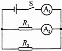 12. (2024·重庆 B 卷)将阻值为 $ 10 \Omega $ 的电阻 $ R_1 $ 与另一电阻 $ R_2 $ 接人电路,如图所示。闭合开关 $ S $,电流表 $ A_1 $ 的示数为 0.45 A,电流表 $ A_2 $ 的示数为 0.3 A。求: