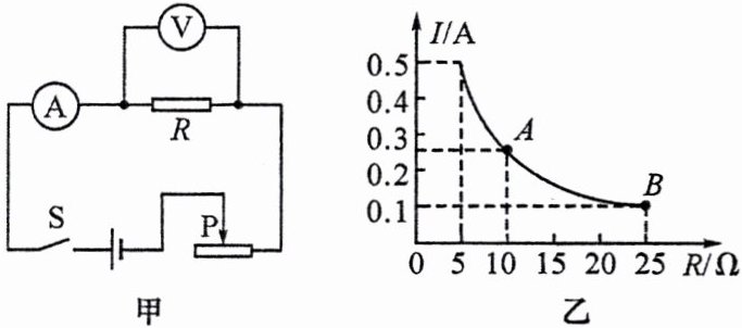 10. 【教材习题改编】在“探究电流与电阻的关系”实验中,电路如图甲所示,图乙是根据实验数据画出的 $ I-R $ 图像。由图像可知,电压表示数始终保持