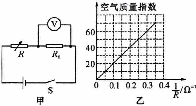 电阻$R$的阻值:$R'=\frac{U_{R}'}{I'}=\frac{3 V}{0.75 A}=4\ \Omega$,则$\frac{1}{R'}=\frac{1}{4\ \Omega}=0.25\ \Omega^{-1}$。由图乙可知空气质量指数为50。
