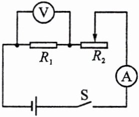 6. 如图所示,定值电阻$R_{1}$和滑动变阻器$R_{2}$连接在电路中,闭合开关$S$,当滑片移到最左端时,电压表的示数为$3V$,电流表的示数为$0.3A$。当滑片移到最右端时,电流表的示数为$0.2A$。求:
