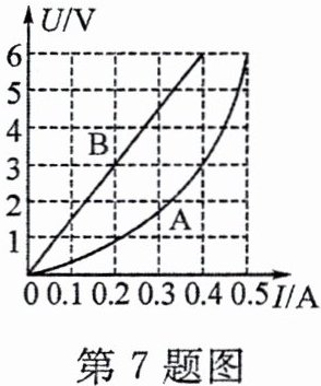 7. 如图所示为电阻 A 和电阻 B 的 U-I 图像,若将两电阻并联在电源电压为 6 V 的电路中,则整个电路的总电流为