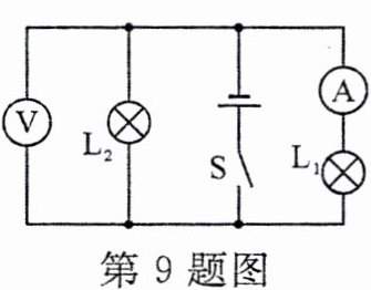 9. 如图所示,电源电压不变,闭合开关,两灯正常发光,电压表和电流表都有示数。一段时间之后,一个电表示数变小,另一个不变,则故障可能是(