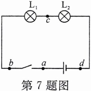 7. 如图所示,闭合开关,发现灯 L₁ 和 L₂ 都不亮,排除接触不良的因素后,小明用电压表逐一与元件并联,以查找故障。测量得出 U_ab = 0,U_ac = 0,U_cd = 6 V,U_ad = 6 V。如果电路只有一处故障,则故障可能为(
