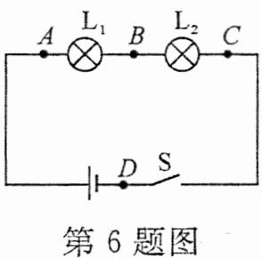 6. 如图所示,闭合开关后两灯均不亮,用一个电流表去检测电路故障。当电流表接 A、B 两点时两灯均不亮;当电流表接 B、C 两点时,有一盏灯亮了,产生这一现象的原因可能是(