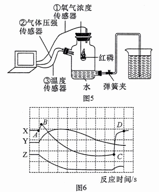 图5是利用传感器测定装置内各物理量的实验装置,图6是传感器测定的实验中温度、氧气浓度和压强随反应时间变化的曲线。