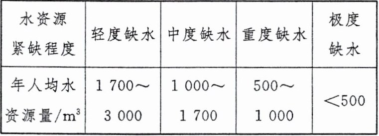 (1)我国年人均水资源量约为2300m³,居世界第109位,水资源短缺程度为