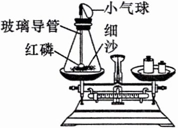 实验方法:如图所示,称量反应前装有红磷的锥形瓶和玻璃导管的总质量$m_{1}$,取下锥形瓶,将玻璃导管下端在酒精灯火焰上灼烧至红热,迅速用橡胶塞将锥形瓶塞紧,引燃红磷。待锥形瓶冷却后,重新放到托盘上称量,称得总质量$m_{2}$。