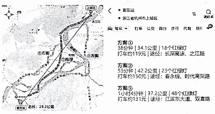 (泰安中考)随着科技的进步,车载导航给人们的出行带来了极大的便利。小宇的爸爸乘出租车从杭州富阳站到上城区,下图是车上的车载导航地图。读图,完成 3~4 题。